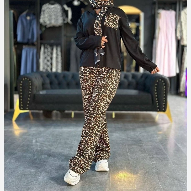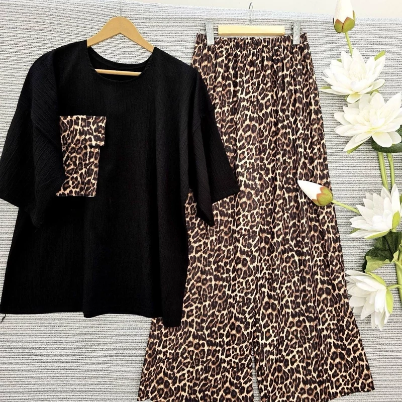 ست تیشرت و شلوار زنانه طرح پلنگی جنس کراش کش فری سایز