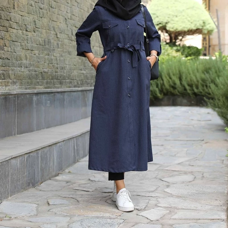 مانتو بلند دانشجویی و اداری زنانه جنس دیپلمات راه راه فری سایز 38 تا 46